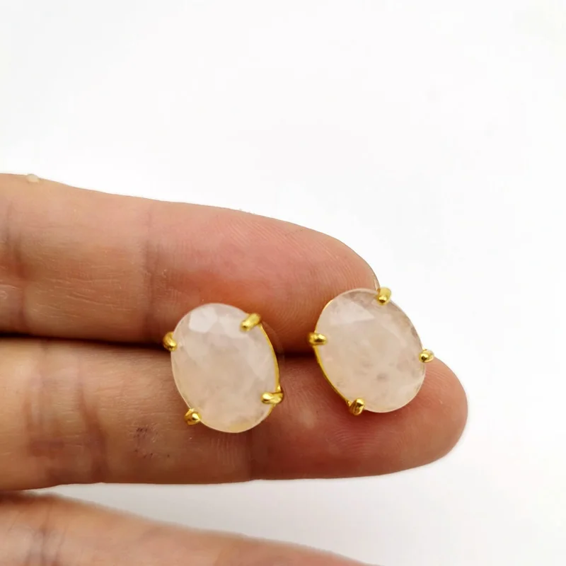 Oval Shape Stud Earrings Silver Color Natural Stone Faceted Pink Quartz Crystal Tiger Eye Lapis Lazuli Healing Jewelry Female